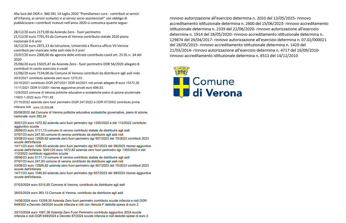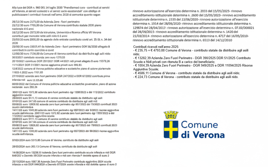 ContattaciLa struttura è in possesso delle qualifiche pedagogiche ed è regolarmente autorizzata dal Comune di Verona, secondo la Legge Regionale n. 22 del 16 agosto 2002 (rinnovo determina dirigenziale n. 4717 del 16/09/2010), e accreditata dalla Regione Veneto (determina dirigenziale n. 1420 del 21/03/2014).